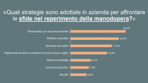 Il sondaggio ha anche chiesto alle aziende quali strategie usino per affrontare le sfide nel reperimento della manodopera, constatando che le misure più popolari siano le partnership accademiche (23,3 per cento), il welfare aziendale (20,4 per cento) e l’aumento dei salari (17,5 per cento). Solo l’8,7 per cento degli intervistati ha dichiarato di non adottare alcuna misura per ovviare al problema.