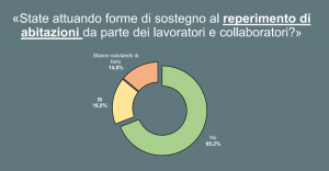 Secondo il sondaggio sulle Best Performer, sono poche le imprese che provano a ovviare direttamente a questo problema. Solo il 16,8 per cento degli intervistati, infatti, dichiara di stare già attuando forme di sostegno al reperimento delle abitazioni. Tra queste, le forme di sostegno più popolari sono affitti agevolati su immobili di proprietà (38,9 per cento), costruzione o ristrutturazione di immobili da mettere a disposizione (33,3 per cento) e l’erogazione di un contributo per il pagamento dei canoni (27,8 per cento). La stragrande maggioranza delle aziende (69,2 per cento), invece, non ha sperimentato questo tipo di agevolazioni per i propri dipendenti e collaboratori – e non programma di farlo – mentre il 14 per cento sta valutando l’introduzione di forme di sostegno.